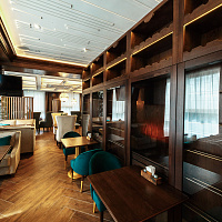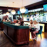 Ресторан с открытой кухней и контактной барной стойкой, обширной винной картой и авторскими коктейлями.