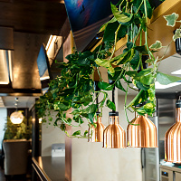 Ресторан с открытой кухней и контактной барной стойкой, обширной винной картой и авторскими коктейлями.